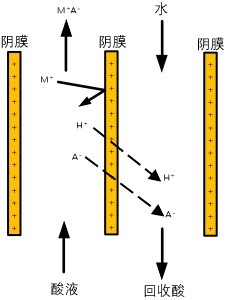 酸回收扩散渗析过程以浓差为驱动力,利用阴离子交换膜对酸的选择透过性和对盐的高截留性,实现溶液中酸与盐的分离,分离出的酸溶液回用于生产工艺。
