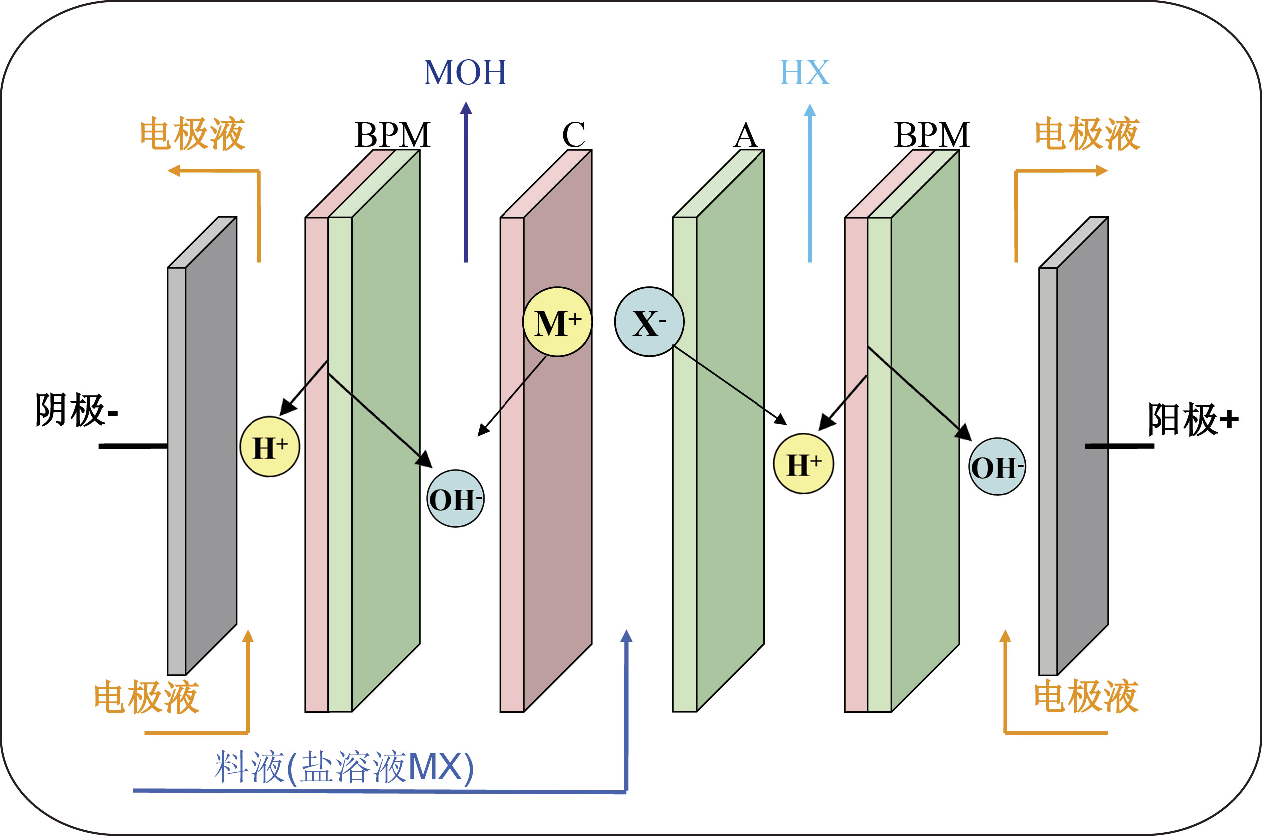 双极膜是一种新型离子交换复合膜, 它通常由阳离子交换层和阴离子交换层复合而成,用荷有不同电荷密度、厚度和性能的膜材料在不同的复合条件下,可制成不同性能和用途的双极膜,这些用途最基本的原理是双极膜界面层的水分子在反向加压时的离解(又称双极膜水解离),即将水分解成氢离子和氢氧根离子。双极膜电渗析就是基于上述的水解离和普通的电渗析原理的基础上发展起来的,它是以双极膜代替普通电渗析的部分阴、阳膜或者在普通电渗析的阴、阳膜之间加上双极膜构成的。双极膜电渗析的最基本应用是从盐溶液(MX)制备相应的酸(HX) 和碱 (MOH),如图所示,料液进入如图所示的三室电渗析膜堆,在直流电场的作用下,盐阴离子 (X-) 通过阴离子交换膜进入酸室,并与双极膜离解的氢离子生成酸 (HX);而盐阳离子(M+) 通过阳离子交换膜进入碱室,在那里与双极膜离解的氢氧根离子形成碱(MOH)。