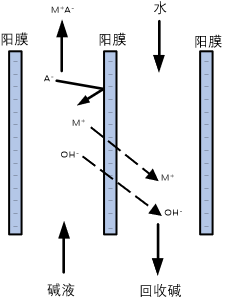 碱回收扩散渗析过程以浓差为驱动力,利用阳离子交换膜对碱的选择透过性和对盐或其它组分的高截留性,实现溶液中碱与盐或其它组分的分离,分离出的碱溶液回用于生产工艺。