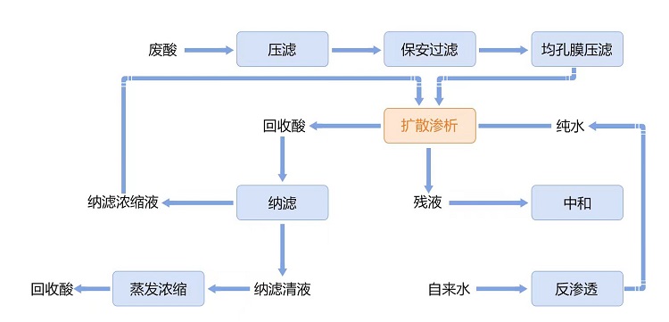该项目以扩散渗析技术为核心,将微滤、扩散渗析和纳滤等过程耦合。采用微滤工艺作为预处理,采用山东天维膜技术有限公司自主研发的高性能扩散渗析膜实现硫酸回收并除去亚铁离子,采用纳滤工艺实现亚铁离子的抛光处理,最终实现钛白粉副产废硫酸的资源化回收利用。