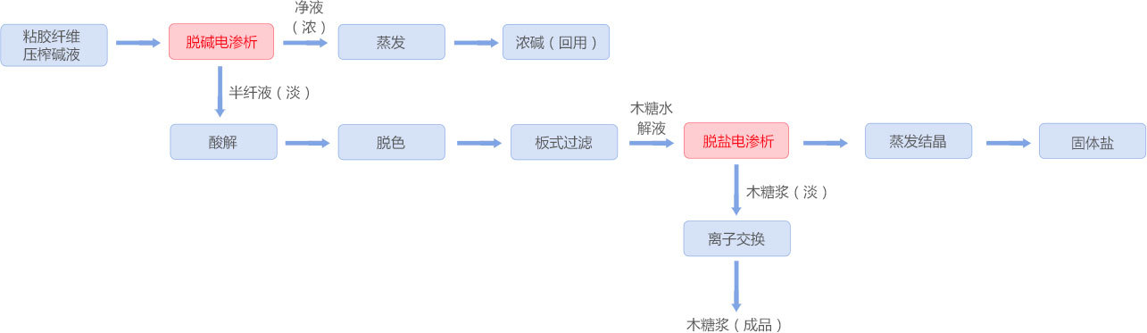 粘胶纤维生产过程中产生大量压榨废碱液,以前转移到污水处理厂用酸中和,不仅产生大量固废,而且造成资源浪费。采用均相膜电渗析装置,压榨碱液经电渗析脱碱回用,脱碱后的半纤经酸解、电渗析脱盐净化后生产木糖,该工艺是工业废弃物资源化利用并实现废水零排放的典型案例。该项目已连续运行两年,全年可实现20万吨高含量半纤维素碱法浆处理回用,对传统产业工艺绿色化改造具有重要意义。
