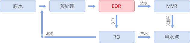 电镀废水由于其水质复杂,各类重金属、COD含量较高,一直是膜浓缩工艺中的难点,采用均相膜电渗析装置有效的解决了此问题,原水经沉降、氧化、超滤预处理后进入电渗析浓缩, 达到12%后进入MVR蒸发,淡水经反渗透处理后回用,电镀废水得到有效处理,达到近零排放。
