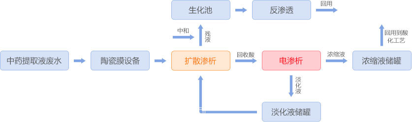 中药提取液废水经陶瓷膜过滤后进入扩散渗析器处理,扩散渗析残液外排至生化处理系统进行生化处理,生化达标水经反渗透过滤产生纯水回用;扩散渗析回收酸(硫酸含量约3%)进入均相膜电渗析器浓缩淡化,淡水可作为扩散渗析接收液回用,浓水浓缩至硫酸含量9%以上回用到中药提取液生产工艺。通过膜集成技术配合传统生化工艺,使该中药提取液废水得以资源化利用。